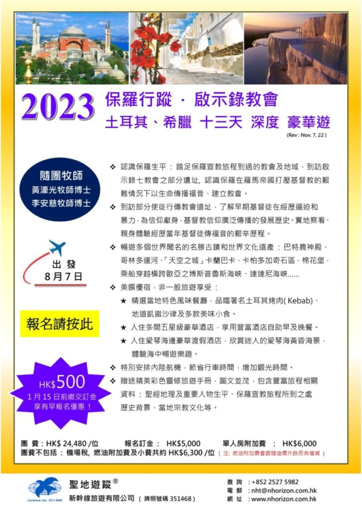 本團由新幹線旅行社主辦,邀請本機構負責人李安慈牧師博士隨團。到訪保羅足跡, 踏足保羅宣教旅程到過的教會及地域,啟示錄七教會之部分遺址,認識保羅在羅馬帝國打壓基督教的艱難情況下以生命傳播福音、建立教會。